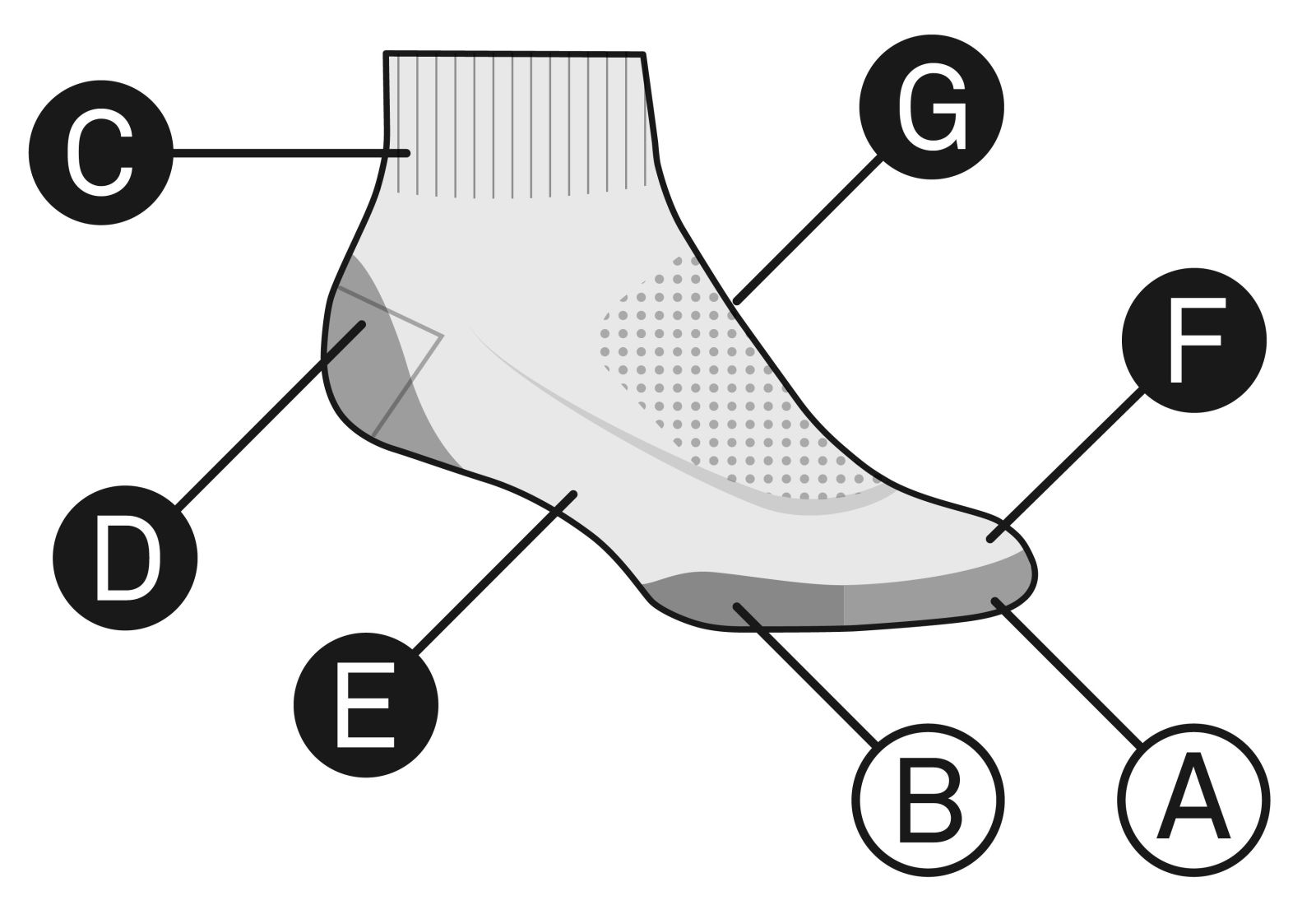 B – Podpora achilovky udrží ponožku na svém místě.