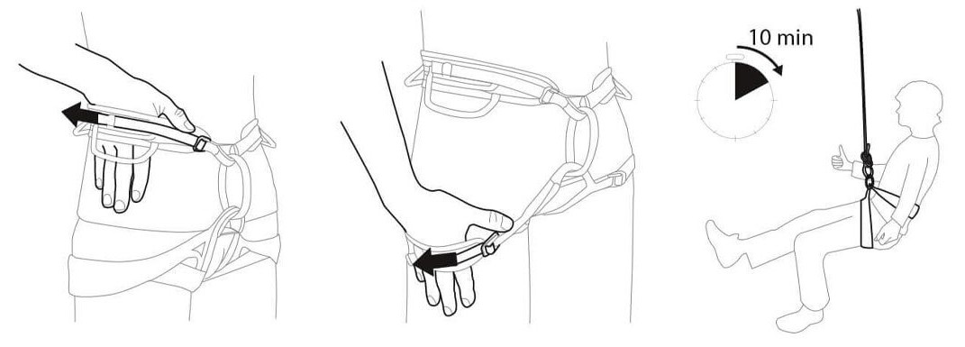 Perfektně padnoucí lezecký úvazek je v pase upevněn tak, aby se nedal přetáhnout přes boky. Je důležité dbát na to, aby materiálové smyčky směřovaly k podlaze a aby poutko na uvázání a poutka na nohou nebyla překroucená. Jak postroj správně utáhnout, je znázorněno na obrázcích: