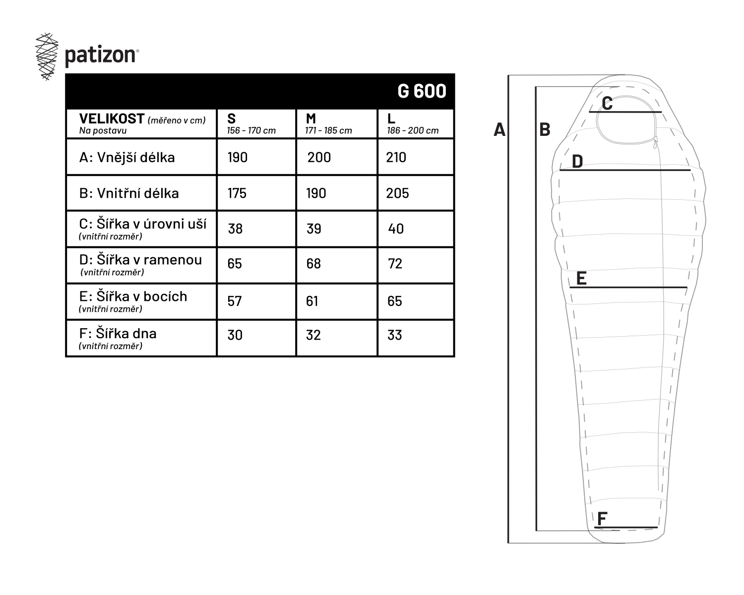- Spací pytel Patizon G600 je třísezonní model navržený jako výkonný mezičlánek mezi modely G400 a G800 — kombinuje výrazné tepelné schopnosti s příjemně nízkou hmotností.
